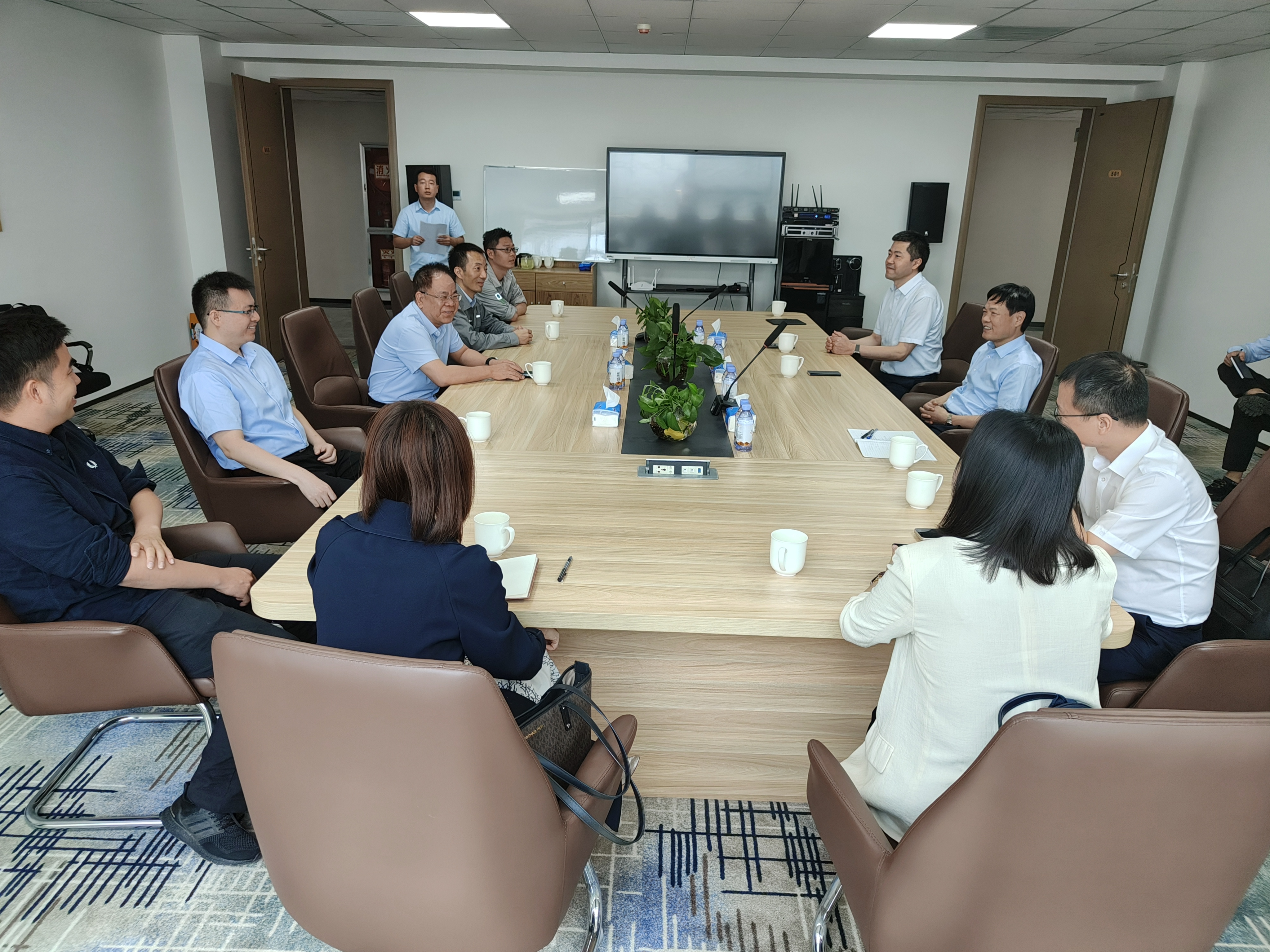 王会民热烈欢迎李立新、邵彦军一行的到来,感谢东华科技为项目建设工作做出的积极贡献,并介绍了项目一阶段工程生产运行、项目进展、产业规划等方面情况。他表示,期待各方继续在源头减碳、中间降碳、末端固碳等领域加强合作,大力推进在新材料、新能源领域的高质量发展。