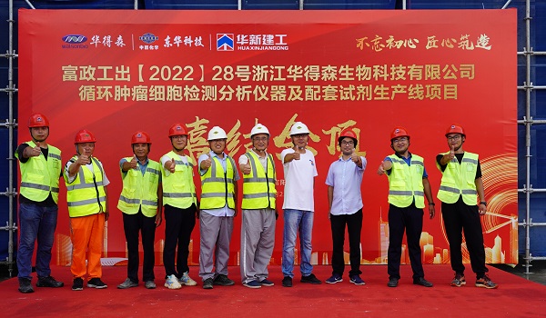7月22日上午8点18分,伴随着爆竹声和混凝土泵车开泵声,浙江华得森循环肿瘤检测仪器生产线项目主体结构封顶仪式正式开始。浙江华得森生物科技有限公司董事长张开山,东华科技建筑景观院负责人,华新建工集团有限公司副总裁、第七工程公司总经理陶宝祥等领导及项目参建人员出席本次活动。