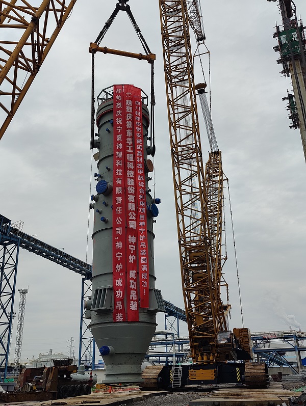 5月24日上午11时17分,东华科技总承包的安徽碳鑫科技甲醇综合利用项目气化装置核心设备气化炉一次性吊装就位。